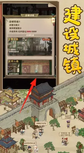 1. 踏入宋代市井地图(以红箭头指示处),对场景(包含建筑与人 物)展开探索,进而触发任务(例如店铺经营相关任务),逐步积累资源。