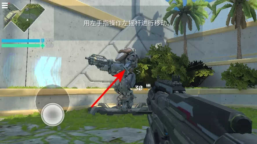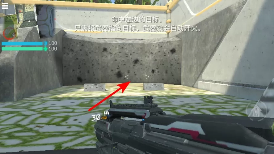 3、将武器指向目标,武器会自动开火,利用这一操作命中左边目标,消灭敌人或完成射击任务,推进游戏进程。
