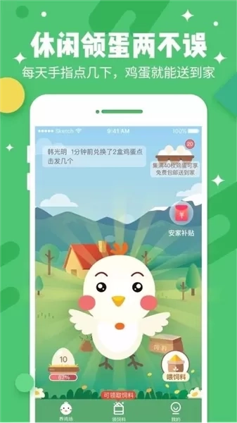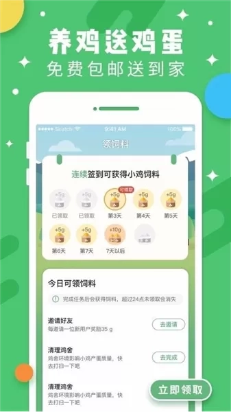 欢乐领鸡蛋红包版是一款以模拟养鸡为主题的休闲益智游戏。玩家在游戏里,能随时随地于虚拟农场感受养鸡的趣味,并且收获鸡蛋。玩家通过完成每日任务获取养鸡饲料,在喂养小鸡使其成长的过程中,还能缩短鸡蛋孵化所需时间。该游戏画风卡通,玩法简便。另外,玩家在游戏中养鸡产出的鸡蛋,既能够用来兑换真实鸡蛋,也可以赠送给好友。