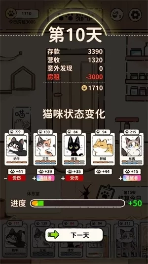 4、点击结算今日后可以完成顾客的订单获得猫猫币,每隔一段时间需要上缴一定的房租来完成任务,并且每完成一个订单猫猫们都会减少一点精力。