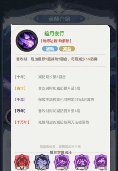 其第一个被动技能“暗月夜行”使得普通攻击命中后为目标施加两层减防效果,每层减少5%防御力。当魂环年限增强后,释放主动技能也能追加减防,最多叠加至4层且不可被清除。这一机制显著提升了全队的输出效率,尤其适合搭配高爆发队友使用。