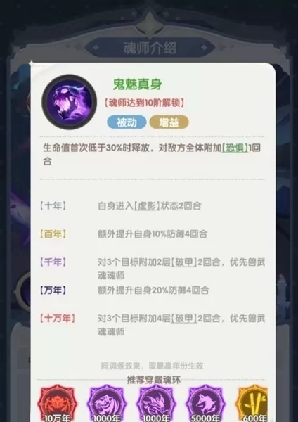 第二个被动技能则赋予鬼魅普攻后对随机敌方单位进行一次追击的能力。魂环升级后,追击还将附带减防效果,并进一步提高对兽武魂魂师的伤害倍率。最后一个被动“鬼魅真身”在自身生命值首次低于30%时触发,释放真身并对全体敌人施加一回合恐惧,使其无法行动。同时,鬼魅进入虚影状态,获得防御力加成,并对多个敌人施加破甲效果,极大增强了生存与反打能力。