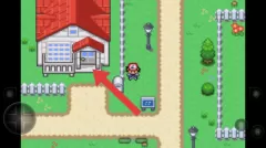 3、展示了游戏中的像素风格室外场景,画面中有玩家角色,还有一栋房屋,玩家需要通关提示去寻找大木博士。