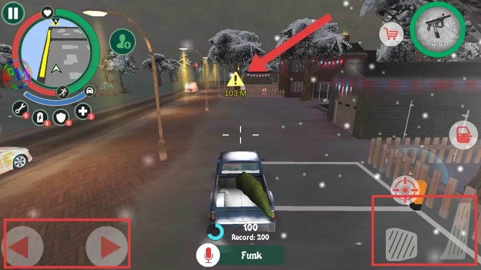 3、驾驶车辆时,通过左侧方向按钮控制行驶方向,右侧踏板按钮控制车速,前往距离标识的任务目标位置(如103M处)。