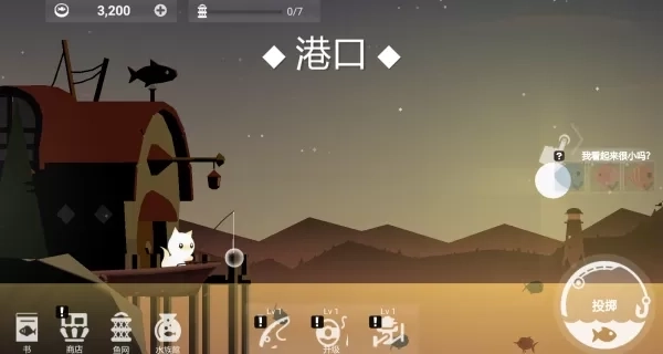 2、你选的钓鱼地点是港口,利用虚拟摇杆操控着猫咪投掷,然后钓鱼。