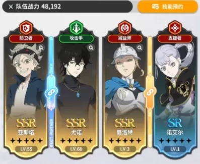 在推进到第1章第3节时,我们会获得【亚斯塔+尤诺+夏洛特】的SSR魔导士组合。根据实际情况再配置任意一位魔导士的话,可靠的「前期阵容]就诞生啦!建议重点养成尤诺,他优秀的战斗能力在冒险中能为你披荆斩棘,让你有个舒服的游戏体验!