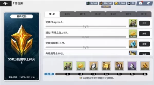 在「7日任务]里面给你们安排了超级丰厚的奖励,有黑水晶以及抽卡资源!达成最终目标,还可以获得5个「SSR万能碎片]!