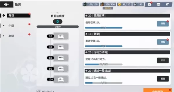 最后,想必你们在第1天完成了很多「任务]呢。「任务]分为「每日任务]、「中级任务]、「高级任务]。记得及时领取丰厚奖励哦~!