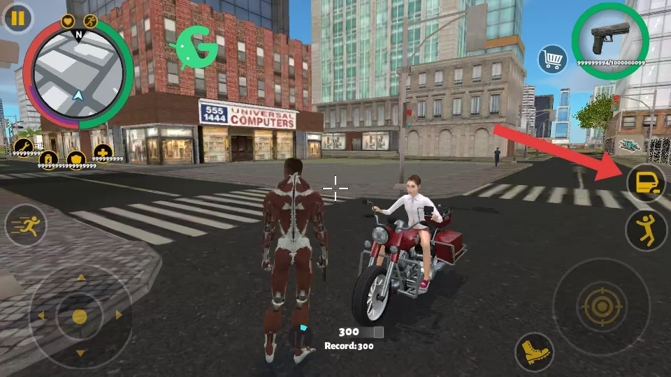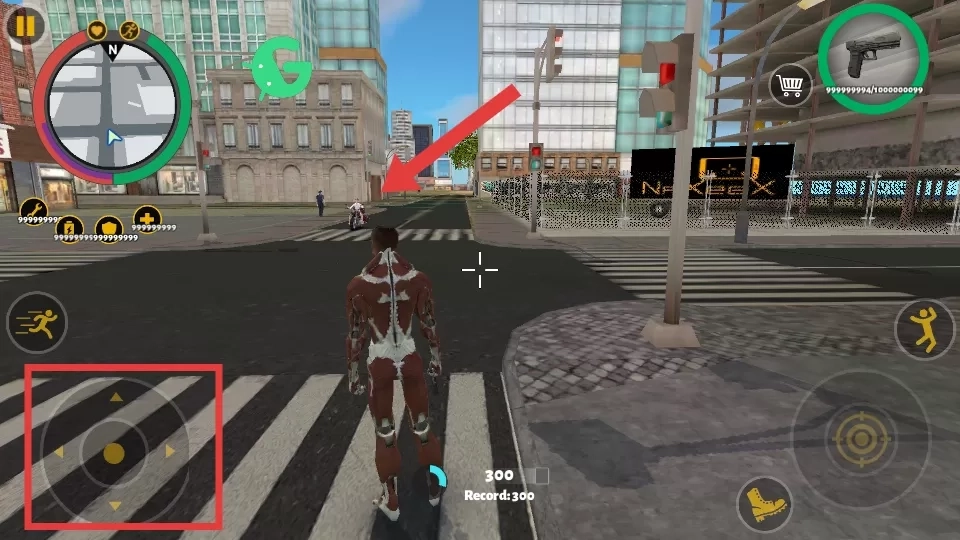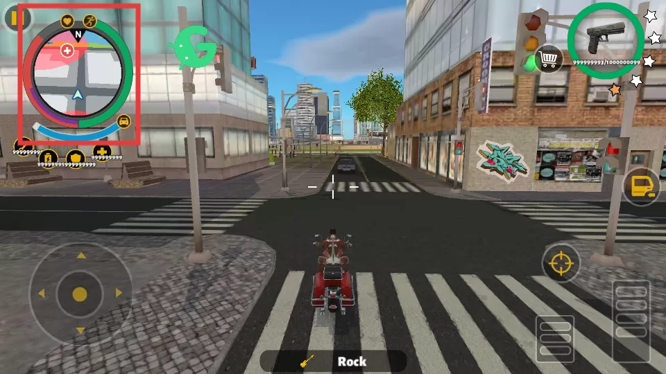 1、通过左侧移动摇杆控制角色在城市中移动,靠近骑摩托车的NPC。