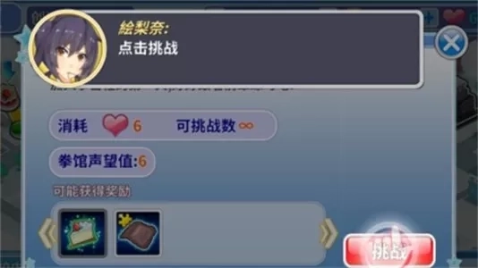 5、点击挑战进入战斗,包括体力消耗、挑战次数、奖励等提示,正式开启美女拳击竞技。