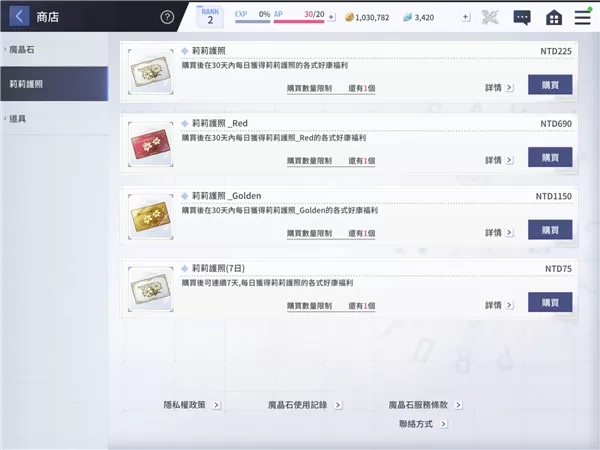 商城课金物品中比较特别的有「莉莉护照」,即一般所谓的月卡,分普通版、Red和Golden,可以分别购入但同一款莉莉护照不能重覆购买。 建议只需要购入普通版(225台币)已足够,可获得活动掉落2倍、每日skip券和弹珠汽水(体力回复道具)等福利。