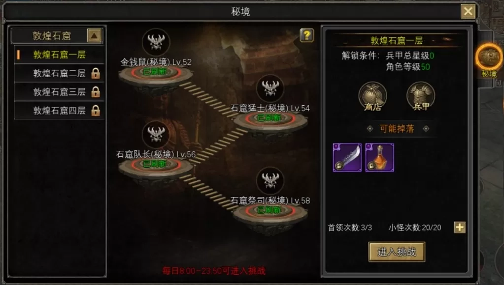 当你的角色等级达到50级,敦煌石窟系列秘境就会为你开启大门。每天8:00-23:50这片神秘领域随时欢迎勇者降临。