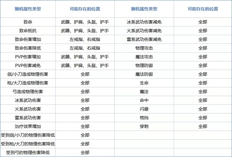 示例为各属性可能出现的部位