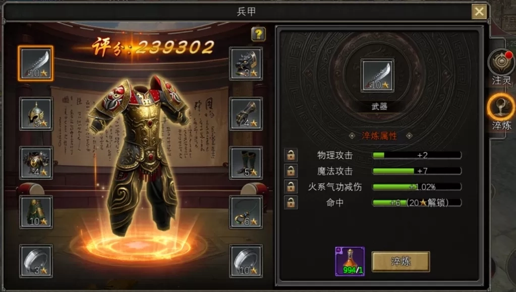 兵甲系统包含10个装备部位,每个部位都能通过注灵提升星级,从1星到10星逐步突破。升星需要消耗同阶本体作为材料,当某个部位升满10星后,就能突破到下一阶段,开启更强的属性成长空间。