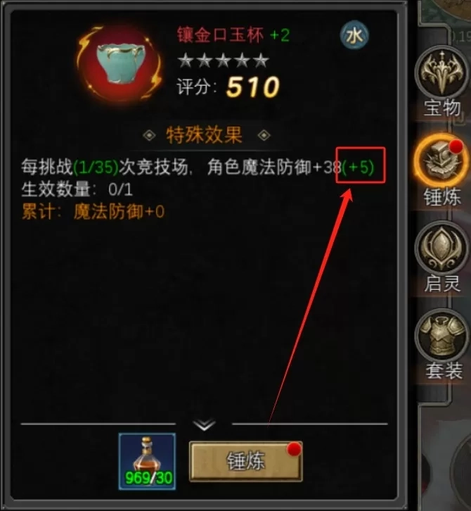 已激活的宝物可以进行锤炼,通过消耗锤炼药剂,可以提升特殊效果中每轮的累计的成长数值。