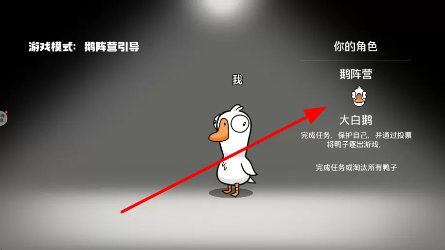 2、挑选不同阵营,比如鹅阵营等。以大白鹅这个角色来说,玩家需要完成任务、保护自身,同时通过投票把鸭子从游戏中淘汰出去。在明确阵营目标后,便可开启游戏。