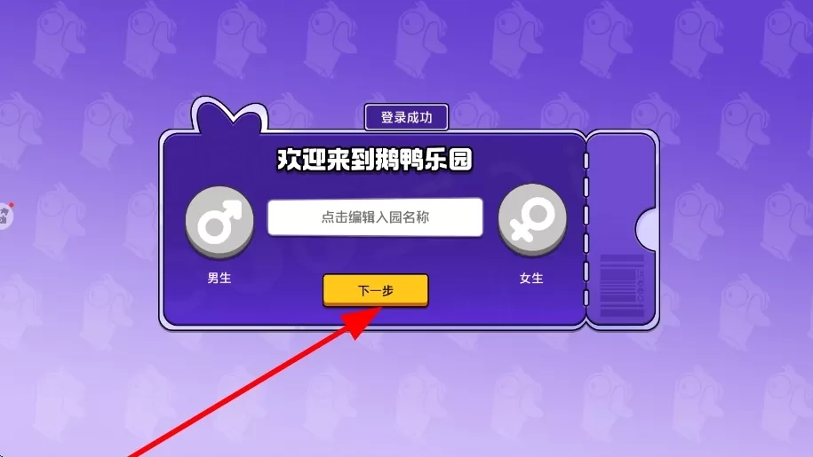 1、进入游戏时,进行入园创建设置,编辑入园名称,选择性别等,完成设置后点击下一步,开启在鹅鸭乐园的游戏之旅。