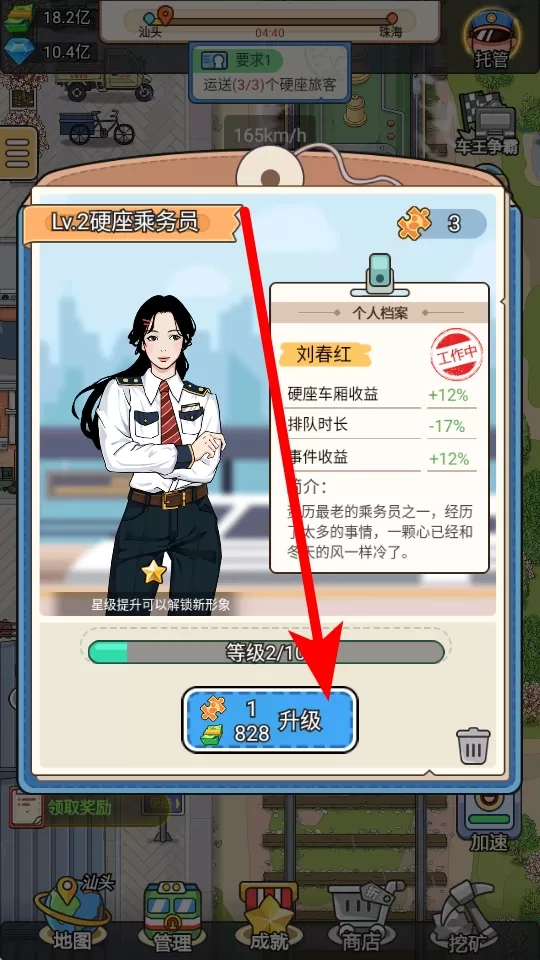 4、找到乘务员界面,像硬座乘务】,消耗拼图碎】和资源点击升级,能提升车厢收益等属性。