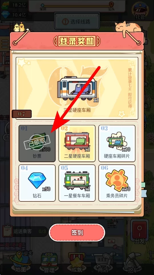1、别忘记领取登录奖励哦,持续累计登录就能获取三星硬座车厢,在登录首日还能领到钞票等奖励。