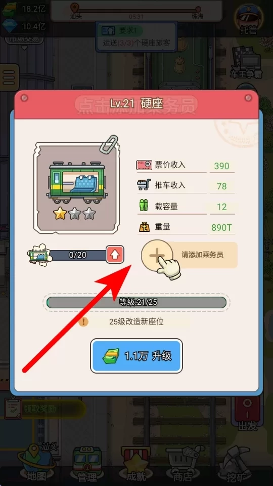 3、可升级车厢,比如硬座车厢,点击升级按钮消耗资源提升等级,还能添加乘务员。