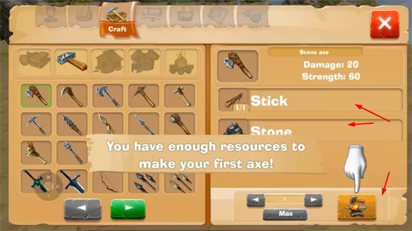 3、在制作界面,使用树枝和石头制作石斧,提升资源获取效率。