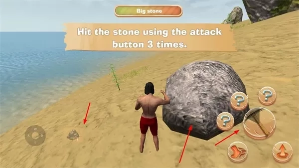 2、点击攻击按钮3次击打石头,获取资源,为制作工具奠定基础。