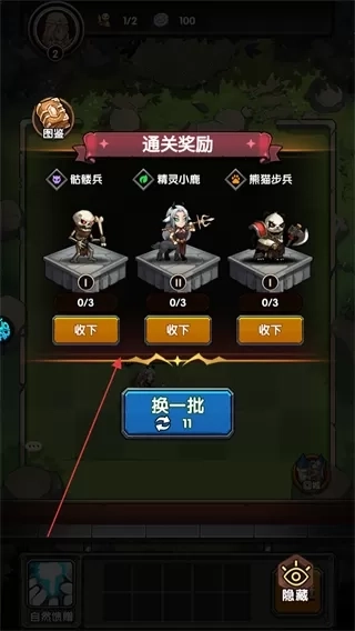 4、通关后,可选择收下骷髅兵、精灵小娜、熊猫步兵等奖励,增强己方战力。