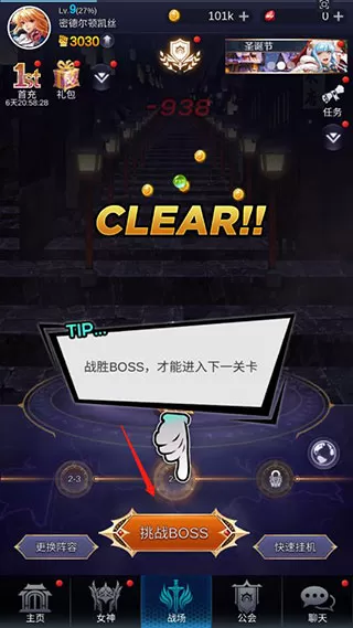 1、游戏中的一大玩法就是挑战BOSS,点击挑战BOSS就可以进入战斗,而且只有战胜了BOSS才可以进入下一关卡;