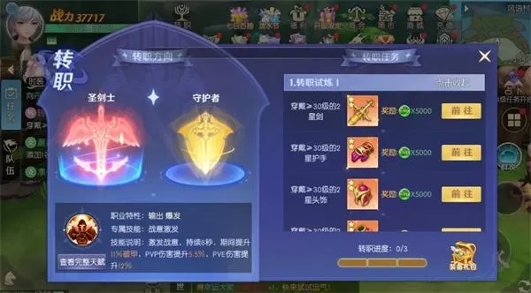 当把身上所有装备都提升至指定星级与品阶后,便可点击前往转职。完成任务后,重中之重是选择转职方向。在此,小编以战士转职为例展开介绍。战士转职后有两个方向,其一是侧重输出与爆发的圣剑士,其二是侧重肉盾与生存方向的守护者。转职后,技能与天赋也会改变。圣剑士能获取专属技能“战意激发”,激活后在持续时间内提升破甲属性,以及PVP和PVE伤害;而守护者的专属技能“圣盾护佑”,可以召唤出护盾保护自身,提升格挡值与防御属性。