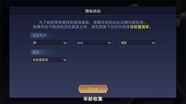 4、登录账号或游客进入游戏后,我们需要首先对国家以及年龄进行填写。注意:年龄不能过于偏小。