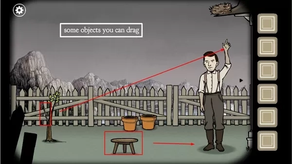 1、接下来进入第二关卡,观察四周,场景有树,椅子,花盆,鸟窝,房子。首先点击旁边的树,点击枯死的树枝,获得道具。