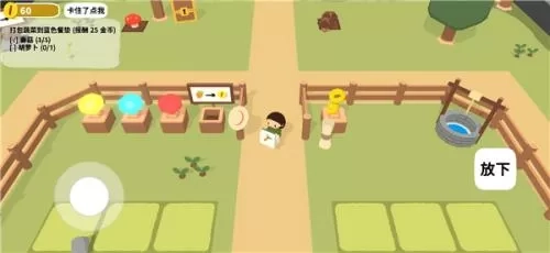 3、点击屏幕上水桶移动人物到种植的土地上会出现浇水按钮,为刚播下的种子浇水,等待作物成长。