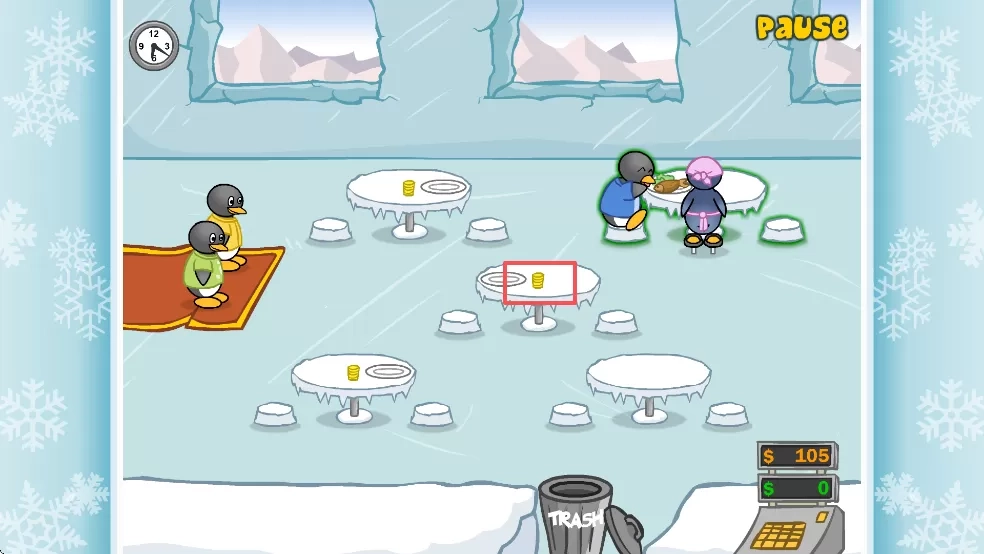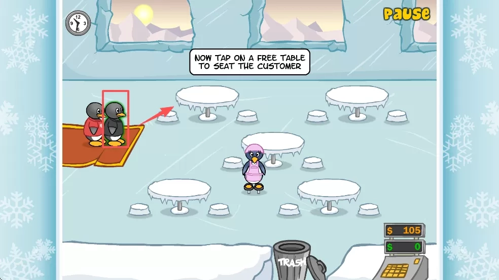 3、将前来用餐的企鹅顾客引导至空桌就座,合理安排座位是高效服务的第一步。