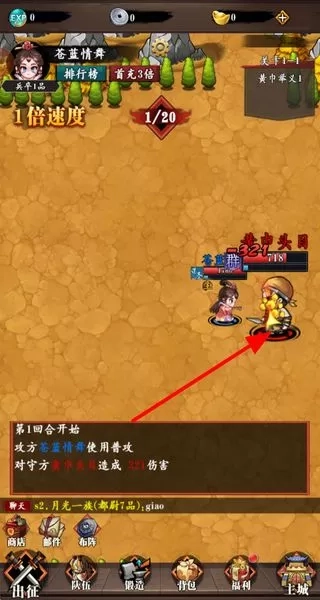 2、参与战斗,在关卡中与黄巾头目等敌人战斗,使用普攻或技能击败对手,获取经验和资源。