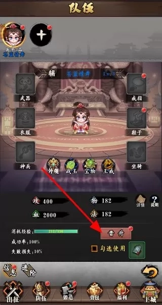 4、晋升角色,在队伍界面消耗经验晋升角色,提升角色的属性和能力,助力在三国志世界的征战。