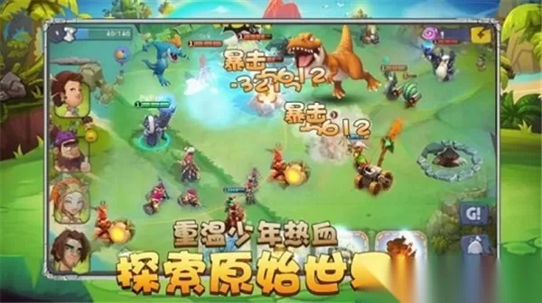 3、原始恐龙作战:角色都是原始人,恐龙由原始人养育,作战时攻击特效特别震撼,玩家可操控原始人与养育的恐龙并肩作战,感受独特的战斗风格。