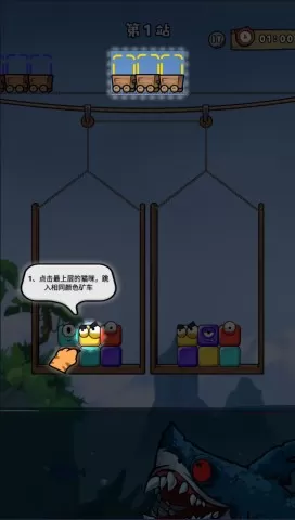 2、通过点击最上层的猫咪,让它跳入相同颜色的矿车,感受消除的快乐。