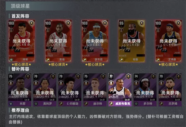 推荐理由:着重于内线进攻,凭借球星卓越的个人能力,以凌厉之势突破对方防线,实现强力得分。(替补球员可依据工资帽灵活更换。)