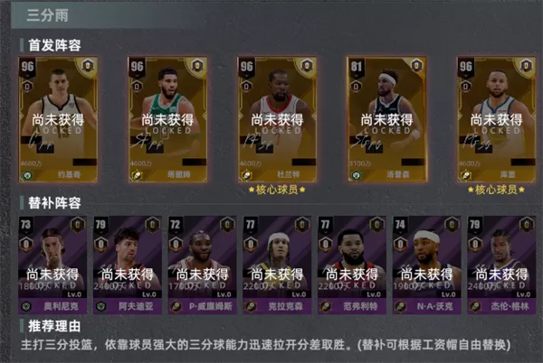 推荐理由:着重于三分投篮,凭借球员出色的三分球能力快速拉开比分差距从而获胜。(替补球员可依据工资帽灵活替换。)
