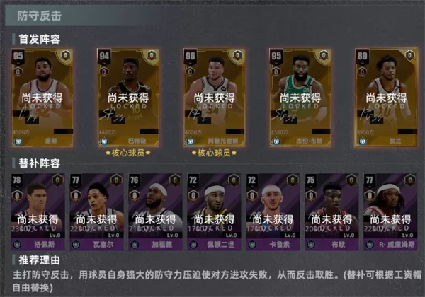 推荐理由:战术核心为防守反击,凭借球员出色的防守能力,迫使对方进攻受挫,进而抓住机会展开反击赢得比赛。(可依据工资帽灵活更换替补球员)