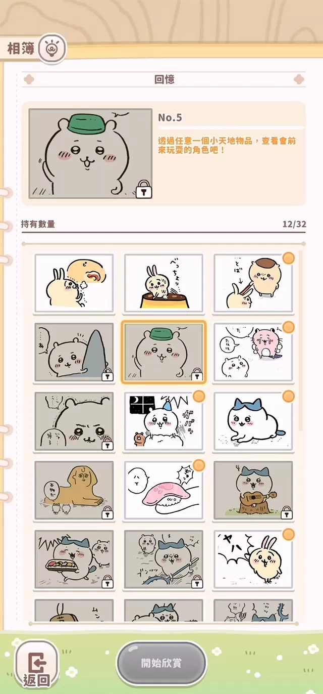 游戏中达成特定条件,例如:获得角色、获得小天地物品等等会解锁与角色或是物品相关的回忆,这些回忆其实就是原作漫画,像是首次获得兔兔时会解锁漫画第一话「兔兔吃披萨包」的内容,可以随时在相簿中欣赏,字幕则会显示在另外的视窗,想要关掉欣赏也没问题,对粉丝来说是很具价值的收藏要素。