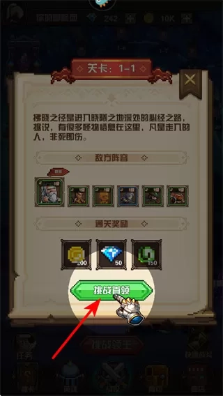 1. 若想进入关卡,可选择挑战首领。在进入关卡之前,能够查看敌方阵容以及通关后可获得的奖励。玩家需依据自身战力,来判断是否发起挑战。一旦挑战成功,便可获取金币。