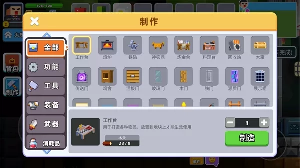 5、点击左侧的制作按钮可以消耗材料来制作不同的物品,包括家具、工具和武器装备。