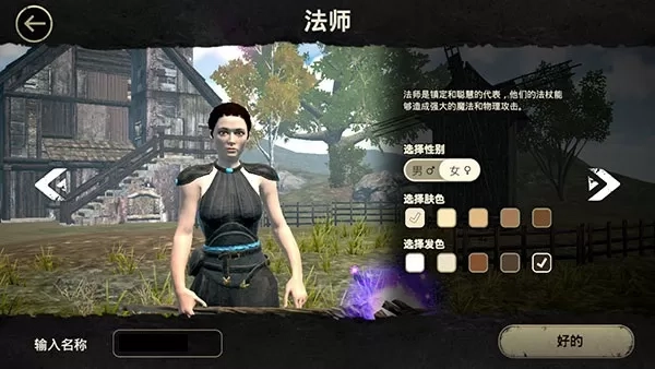 2、我们以法师为例,接着再设定性别、肤色、发色、昵称后,就可以开始冒险了。