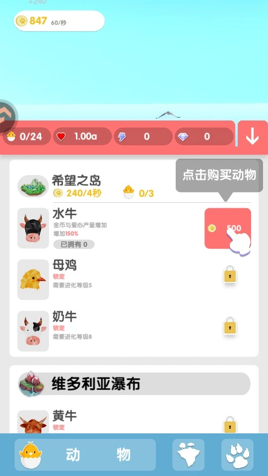 3、拥有足够金币后我们可以购买动物,增加岛屿的金币和爱心产出,并增添生机。