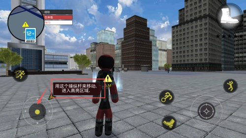 1、操控角色移动:通过左下角的操纵杆,即可控制角色在城市里穿梭,探索各个不同的区域。