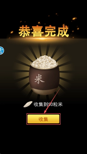 3、达成收集:当成功收集到50粒米时,点击“收集”按钮,即可完成本阶段的米粒收集工作。