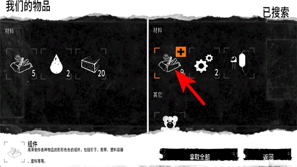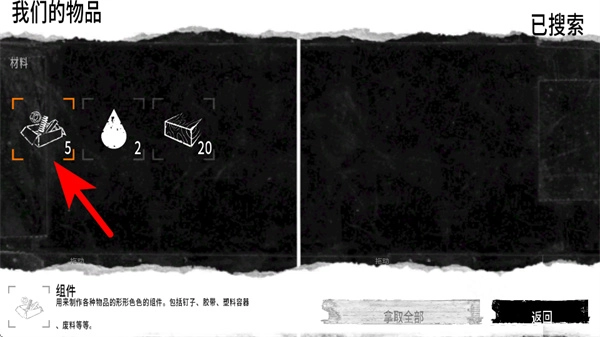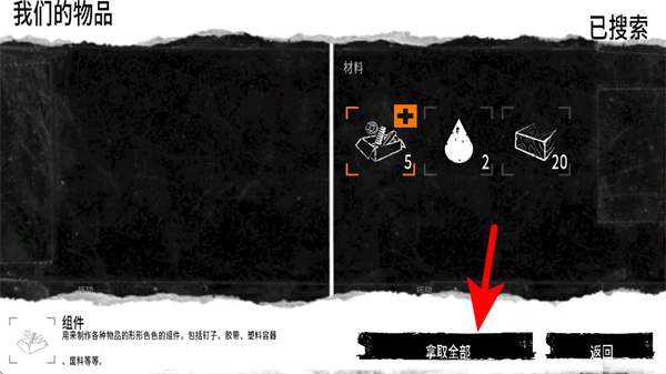 1、点击“获取全部”按钮,即可将当前搜索到的组件、水滴等各类材料全部收纳至物品栏,完成收集操作。
