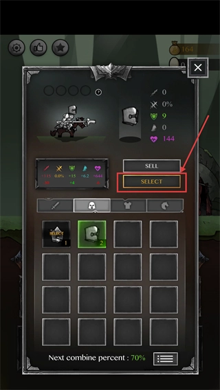 1、进入装备选择界面后,点击【SELECT】按钮并选择【头盔】装备,能够提升血量等属性,为后续战斗提供助力。