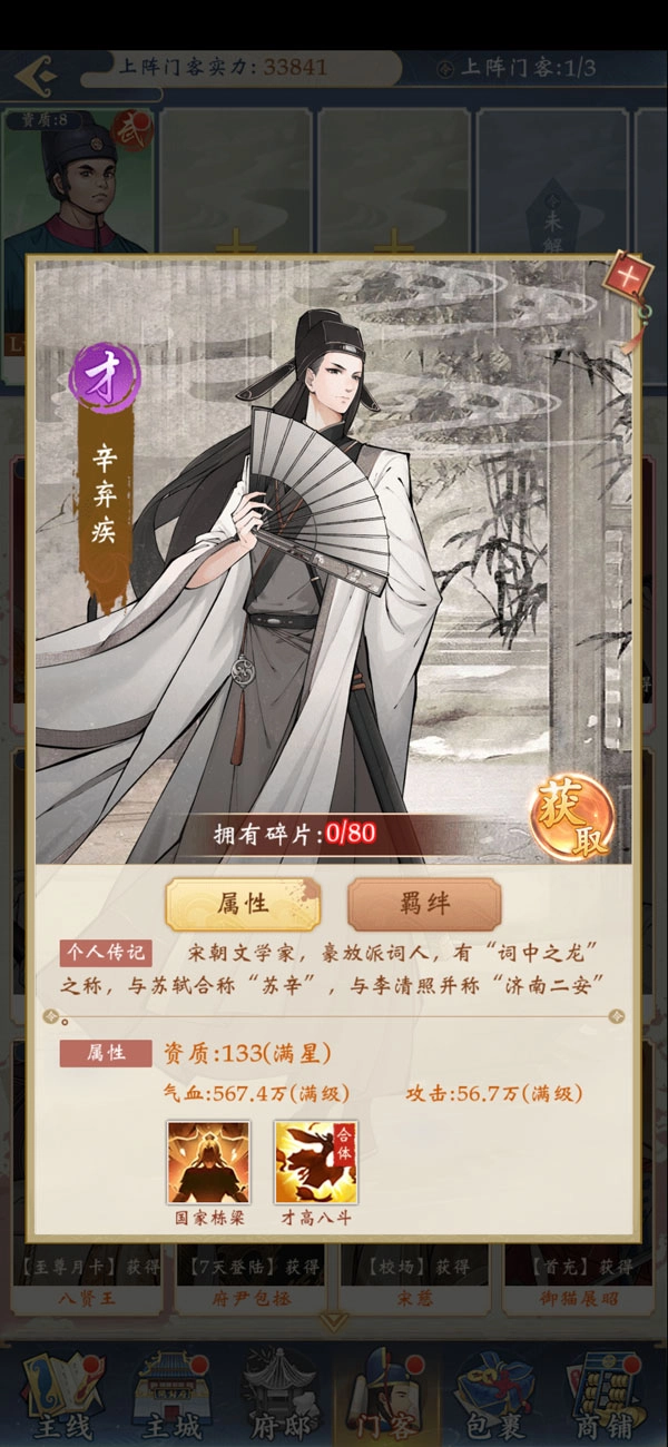 在橙色品质的门客中,八贤王、辛弃疾、李清照、宋仁宗、白玉堂、欧阳春、赵匡胤、御猫展昭这类角色均需通过付费等途径获取;后续可依据他们各自对应的羁绊效果与合体关联,来安排上阵使用。